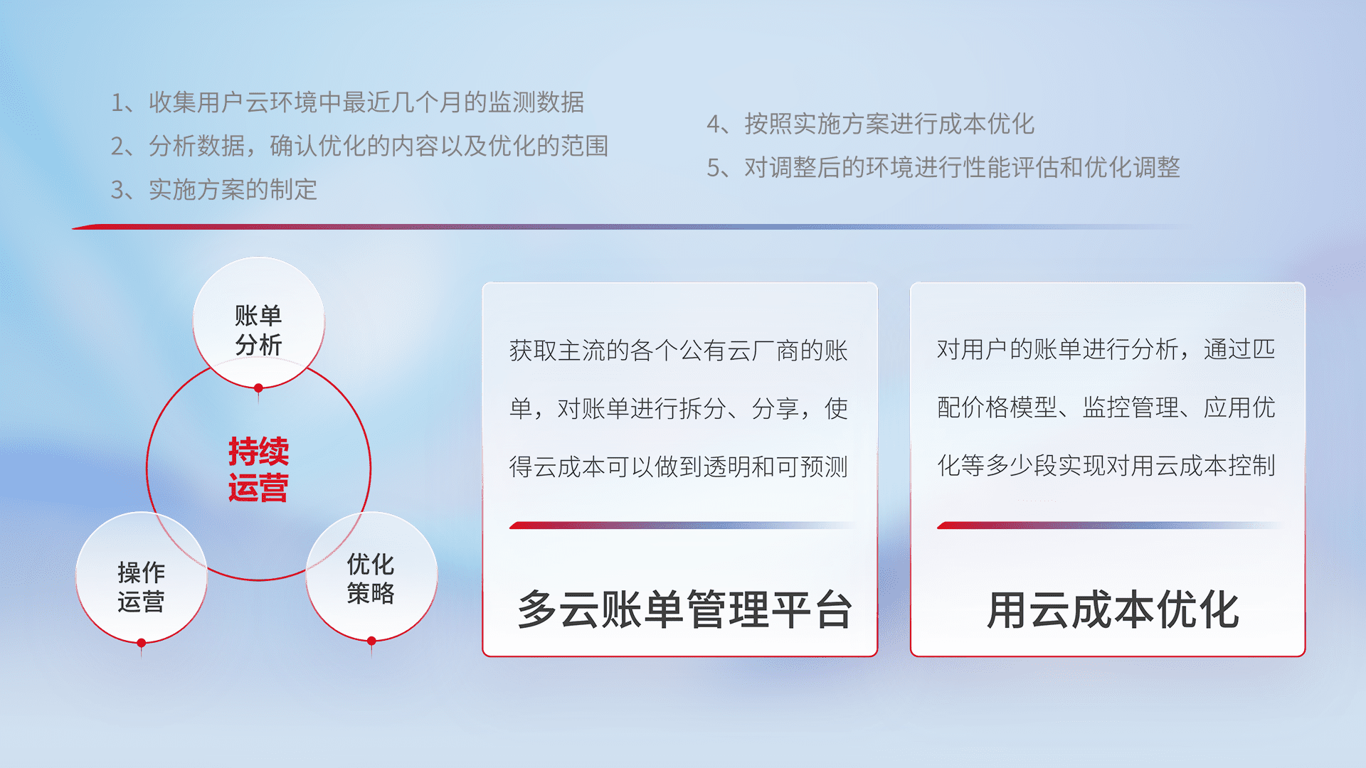 通过多云纳管,,以统一的资源数据模型把客户的云资源进行抽象和封装,,,,进而实现对多云资源的统一操作,,,保障云资源管理的可靠性、、稳定性与可用性。。。。量身定制化运维内容,,配置、、、、开发运维、、补丁管理、、备份、、、、监控、、认证和访问管理、、审计和日常巡检等,,,,保障在用云过程中的可靠度,,,稳定度以及高可用率。。。